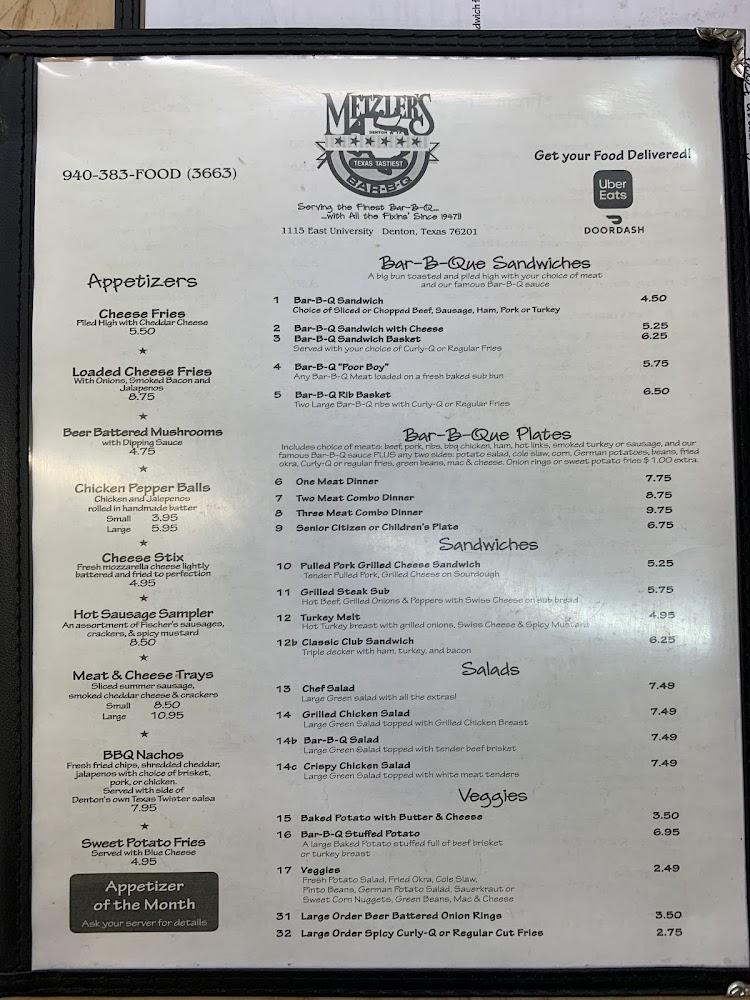 Guests rave about the chicken fried steak and brisket. For those on the go, the Bar-B-Q To Go section caters with its versatile meat selections, ideal for BBQ lovers. Metzlers caters to diverse palates, ensuring there's something delightful for everyone. With freshly prepared meals and a welcoming atmosphere, it secures a spot on every Denton diner's list. Every dish invites you to savor quality and tradition in every bite, making dining memorable and satisfying.