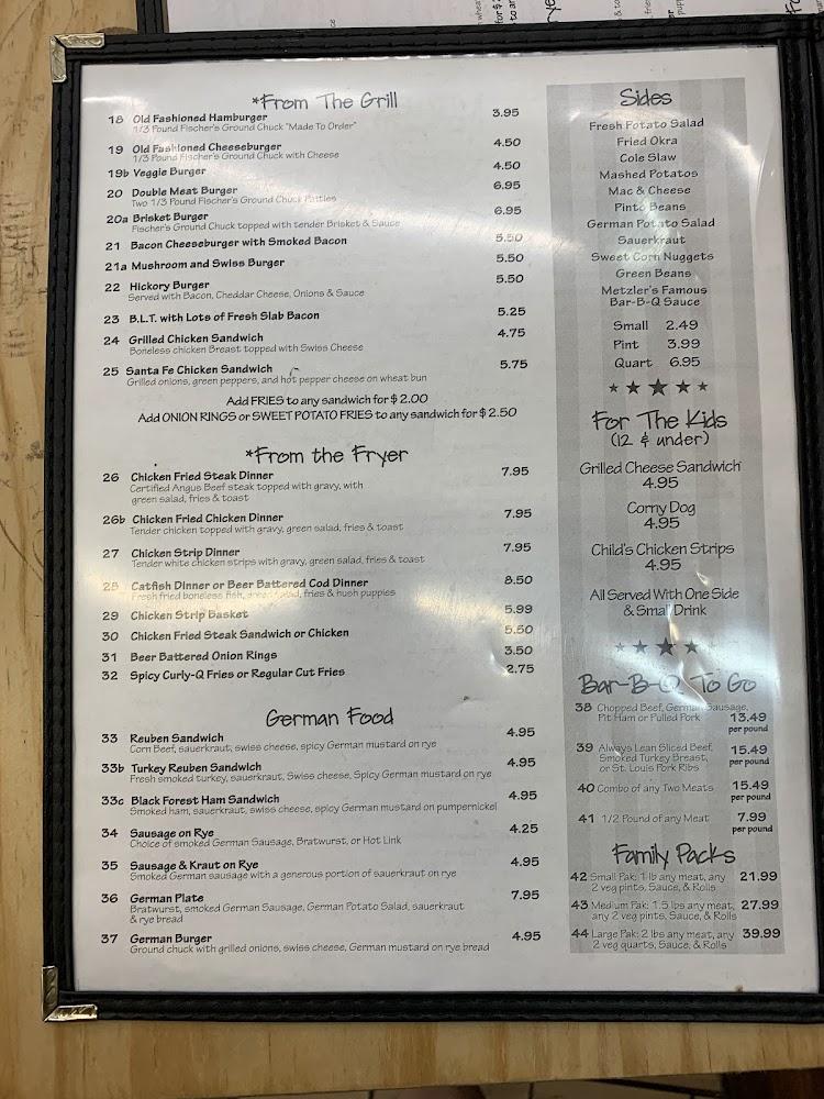 Metzlers' menu is a testament to variety and flavor, deeply rooted in German and American traditions. It offers appetizers like beer-battered mushrooms. Bar-B-Que selections shine with sandwiches and plates featuring tender meats. German favorites celebrate flavors with Reuben sandwiches and sausages on rye. Vegetarians find choices too, with dishes like the veggie burger. Families love the child-friendly menu, including meals well-priced around $5.50. Desserts conclude meals on a sweet note.